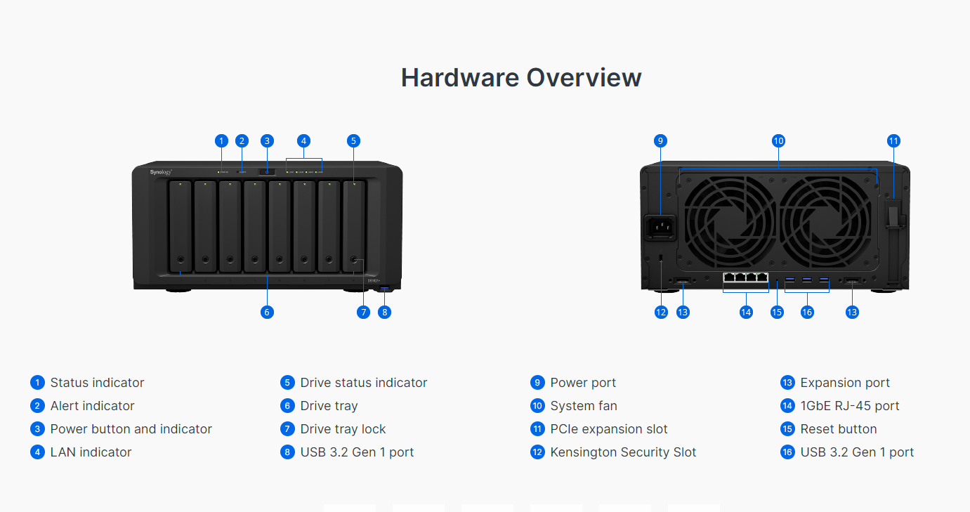 - Capacitate Maximă Internă: 96 TB standard (8 x 16 TB), 256 TB cu unitate de expansiune (96 TB + 10 x 16 TB)